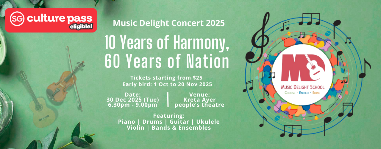 Join us for a special evening as we celebrate our school’s 10th anniversary alongside Singapore’s 60th year! Enjoy an exciting line-up of music — from violin and piano solos to band, guitar, ukulele, drums, and keyboard ensembles. A night of melodies, memories, and harmony you won’t forget! ✨